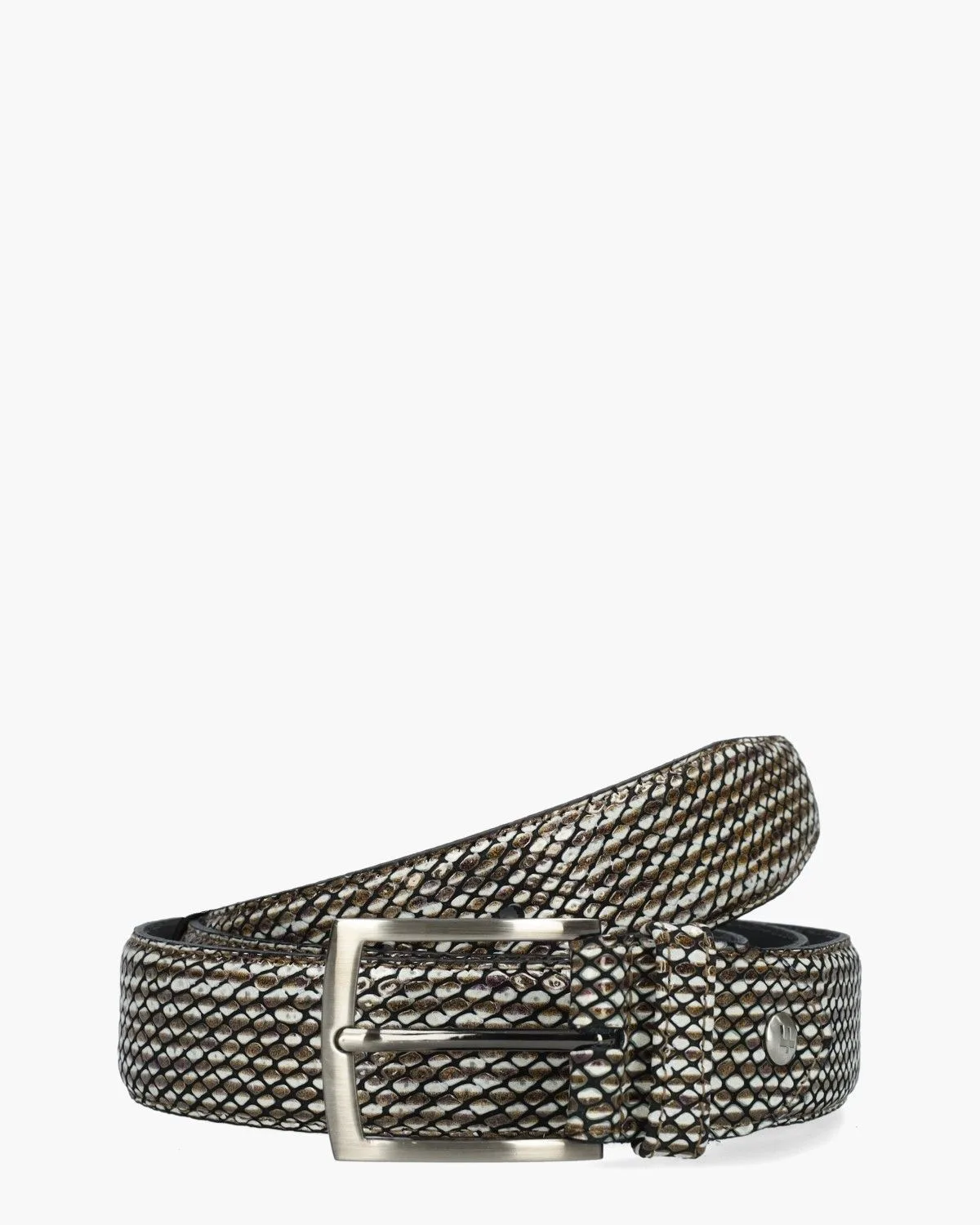 De De Belter 52.21/CFM-10095-20-03 van Floris Van Bommel is uitgevoerd in hoogwaardig leer en voorzien van een opvallende donkerbruine/gebroken witte crocoprint. De riem is 3,5 cm breed. De combinatie van rijke materialen en een zilverkleurige gesp geeft de riem een luxe look. De subtiele FVB-button benadrukt de kwaliteit van het