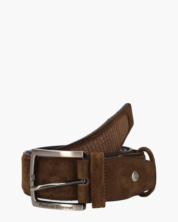 Stijlvolle riem voor heren De Belter 60.49/CFM-10022-23-08 uit de collectie van het Nederlandse merk Floris Van Bommel. Deze riem is gemaakt van bruin suède en leer met een gevlochten structuur en heeft een leren voering aan de binnenkant. De riem is 3,5 cm breed. Een zilveren gesp en een subtiel metalen Floris Van Bommel-button maken de
