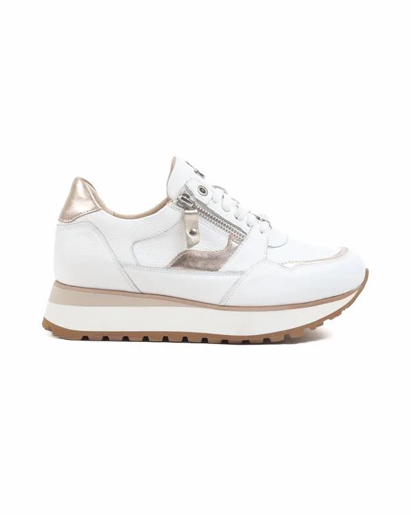 Elke 'White-Champagne': Sportieve Elegantie in Wijdte HOntmoet de Elke 31.008-1120, een sneaker die bewijst dat stijl en optimaal comfort moeiteloos samengaan. Deze 'White Combi' uitvoering is de perfecte luxe basissneaker voor je garderobe. Speciaal ontwikkeld voor dames die extra ruimte nodig hebben, biedt dit model in wijdte H een zorgeloze pasvorm voor de iets bredere voet.Waarom de Elke 31.008 een must-have is:Comfortabele H-Wijdte: Dit model uit de 31-serie biedt extra volume bij de voorvoet en de wreef. Geen knellende randen meer, maar een pasvorm die de hele dag door prettig aanvoelt.Hoogwaardig Cow Nappa: Vervaardigd uit soepel, wit rundleer met een natuurlijke nerf. Dit materiaal ademt uitstekend en vormt zich soepel naar je voet.Luxe Metallic Accenten: De sneaker krijgt een chique upgrade door de subtiele champagne-gouden details op de hiel en de zijkant. De zilverkleurige rits geeft het geheel een moderne, frisse touch.Dubbel Gemak: Naast de klassieke vetersluiting is de Elke voorzien van een functionele ritssluiting. Eenmaal de veters op maat gestrikt, stap je voortaan razendsnel in en uit je schoenen.Dempende Platformzool: De gelaagde zool met beige tussenzool zorgt voor een eigentijds silhouet en superieure schokabsorptie. De stevige kartelzool biedt maximale grip bij elke stap die je zet.Details op een rij:Artikelnummer: 31.008-1120Wijdtemaat: H (Breed)Materiaal: Cow Nappa & Metallic detailsKleur: White-Champagne (Wit met goud- en zilveraccenten)Voetbed: Uitneembaar (geschikt voor eigen steunzolen) Styling tip: Deze witte sneaker is een echte kameleon. Draag ze onder een trendy jumpsuit of een luchtige zomerjurk voor een vrouwelijke look met een sportieve knipoog.