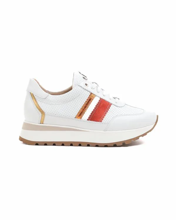 Deze stijlvolle sneakers, model Erika, combineren een sportieve look met luxe details en verfijnde materialen. De schoen is uitgevoerd in hoogwaardig wit nappaleer met subtiele perforaties, wat zorgt voor een luchtige uitstraling en optimaal draagcomfort.Design & DetailsWat deze sneaker direct in het oog doet springen, zijn de kleurrijke accenten aan de zijkant:Contraststrepen: Een dynamische combinatie van een oranje glitterstreep en een warmrode suède streep.Metallic accenten: De hiel is afgewerkt met een goudkleurig detail dat een vleugje glamour toevoegt aan het sportieve ontwerp.Zool: De opvallende platformzool (plateauzool) in wit en beige geeft niet alleen extra lengte, maar biedt ook uitstekende demping. De kartelrand in een natuurlijke gom-kleur zorgt voor een goede grip en een stoere touch.Belangrijkste KenmerkenMateriaal: Hoogwaardig leer (Nappa) met geperforeerde panelen.Sluiting: Klassieke vetersluiting voor een perfecte pasvorm.Stijl: Een veelzijdige sneaker die moeiteloos past onder zowel een casual jeans als een zomerse rok of jurk.