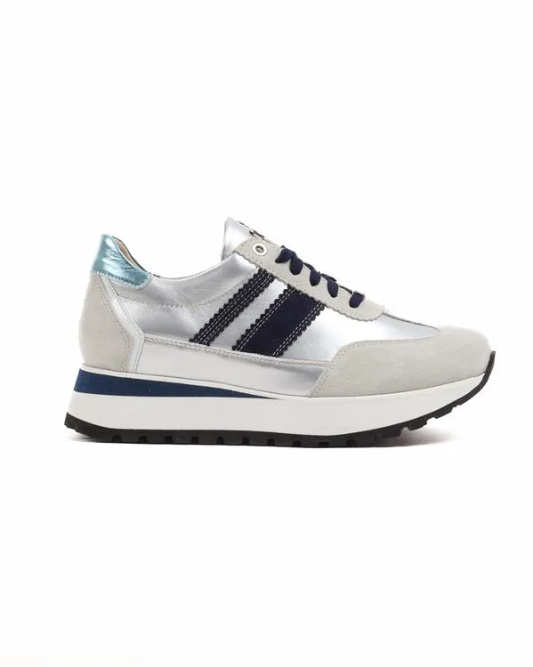 Deze Footnotes Erika sneaker in de kleur Soft Metal Matte Dark Bleu is een moderne klassieker die sportiviteit moeiteloos combineert met een luxe uitstraling. Met zijn glanzende zilveren finish en diepblauwe accenten is dit een veelzijdige schoen voor de modebewuste vrouw. Futuristisch & Elegant DesignDe sneaker valt op door een dynamisch spel van materialen en kleuren:Metallic Silver: Het bovenwerk is grotendeels uitgevoerd in hoogwaardig zilverkleurig leer ("soft metal"), wat de schoen een eigentijdse en frisse look geeft.Dark Bleu Accenten: De kenmerkende banen op de zijkant en de veters zijn uitgevoerd in een rijke, diepblauwe suède (matte dark bleu), wat zorgt voor een stijlvol contrast.Suede Finish: De neus en hiel zijn voorzien van lichtgrijs suède voor een zachte textuur en extra stevigheid.Hielaccent: Een opvallend lichtblauw metallic detail op de hielkap geeft de schoen een extra speels kleuraccent. Comfort & ZooltechniekNet als de andere Erika-modellen, biedt deze variant het vertrouwde Footnotes-comfort:Platform-zool: De sneaker beschikt over een dikke witte tussenzool voor uitstekende demping en een moderne silhouet.Kleurdetail: Een donkerblauwe lijn in de tussenzool accentueert het ontwerp en sluit aan bij de suède details van het bovenwerk.Grip: De zwarte rubberen loopzool heeft een grof kartelprofiel, wat zorgt voor maximale stabiliteit en een sportieve afwikkeling van de voet. StylingtipDe combinatie van zilver en donkerblauw maakt deze sneaker perfect voor zowel een casual als een zakelijke outfit:Casual: Draag ze onder een boyfriend jeans met een wit T-shirt.Business Casual: Combineer de sneakers met een donkerblauwe pantalon en een zilverkleurige top voor een harmonieuze, professionele look.