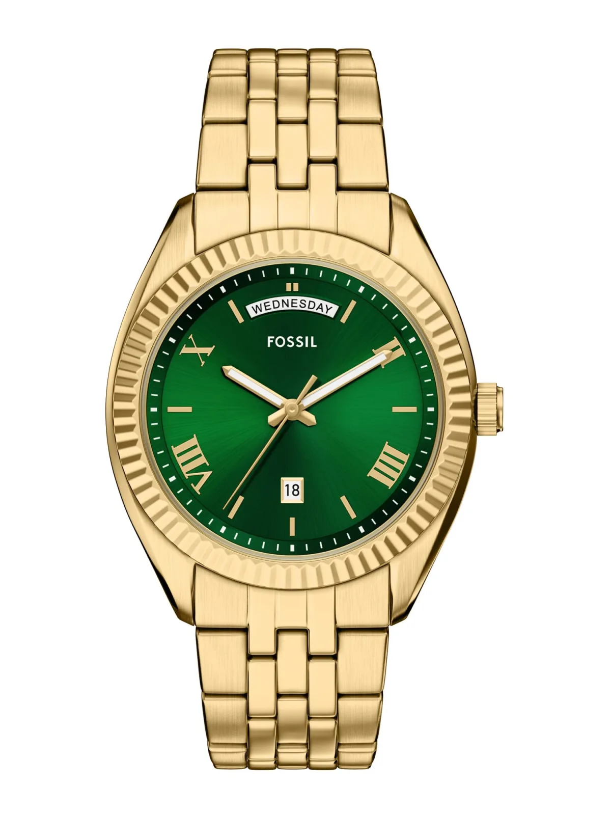 Specificaties: FOSSIL Analoog horloge ‘Campbell’ goud / smaragd