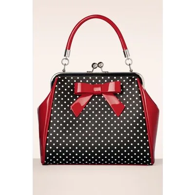 Ook Banned heeft dit seizoen weer je 'bag' met deze 50s Frances Polka Star Bag in Black and Red! Deze beauty heeft een opvallende zilverkleurige metalen knipsluiting en is uitgevoerd in een combinatie van lipstickrood 'faux' lakleder en zwart 'faux' leder afgewerkt met een schattige strik en een print van witte polkadots. Ze wordt bovendien geleverd met een langer, verstelbaar hengsel zodat je haar ook speels om je schouder kunt dragen. En al je essentials passen er met gemak in, dus volg je (vintage) modehartje en bestel haar nu! * Medium sized * Knipsluiting * Binnenvak met 3 extra vakjes, waarvan 1 met rits * Afneembaar hengsel * Kan crossbody gedragen worden * Volledig gevoerd * Groot genoeg voor je telefoon, sleutels, en portemonnee