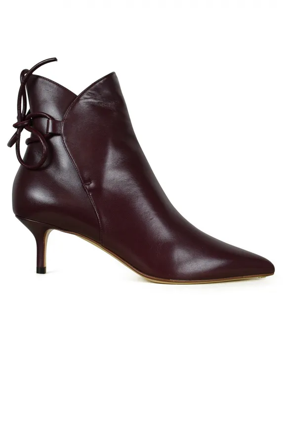 Bordeauxrode leren enkellaarsjes.Bordeauxrode leren vetersluiting aan de achterkant van de schoen.Hak van 5 cm.Made in Italy.