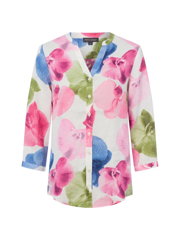 Blouse type: Klassieke blouse; Type sluiting: Knoopsluiting; Materiaal: Linnen; Motief: Bloemenprint; Kraag: Tuniek kraag; Details: Plooien; Pasvorm: Normale pasvorm; Armlengte: Driekwart mouw; Lengte: Lange pasvorm