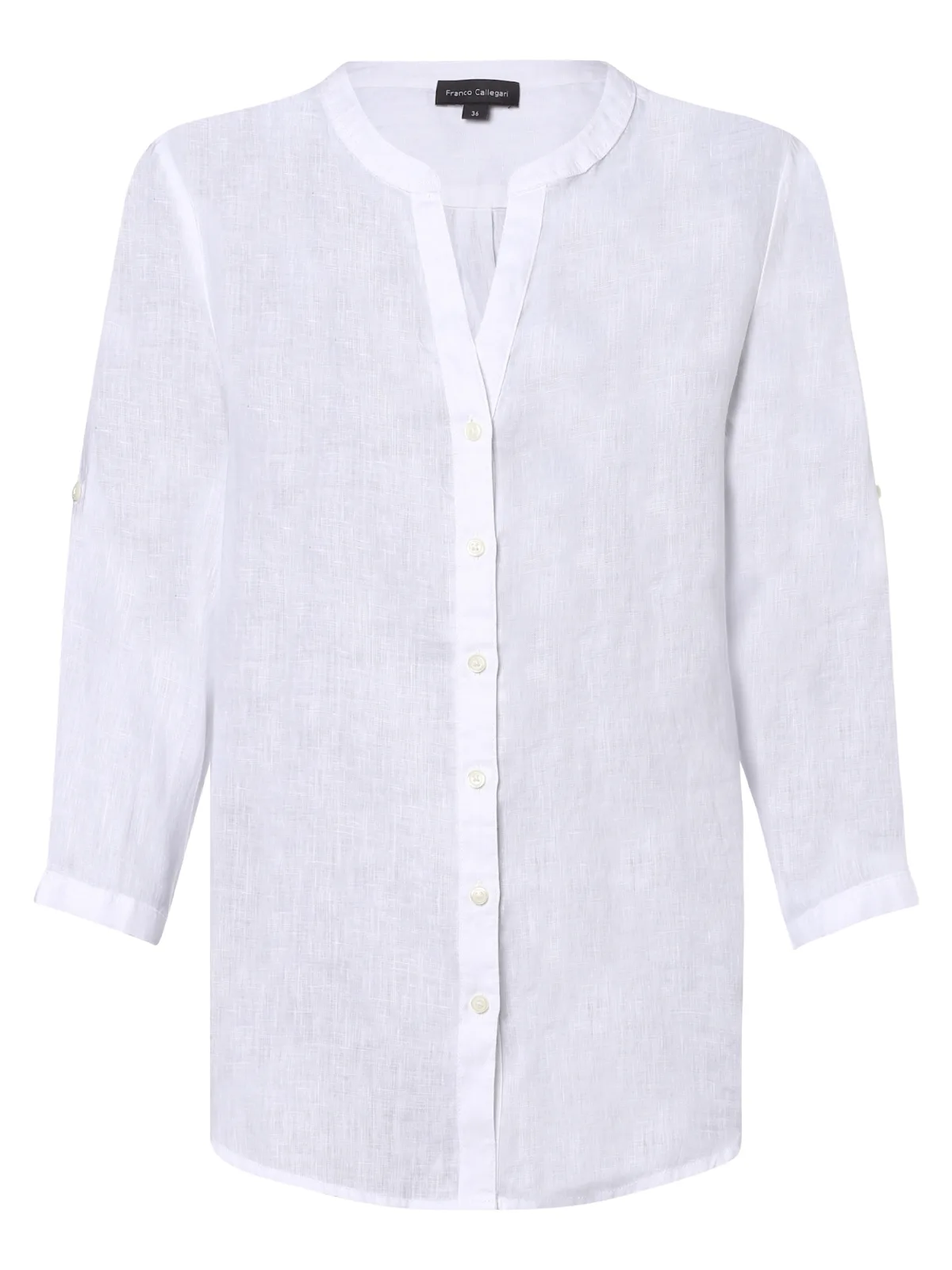 Blouse type: Klassieke blouse; Type sluiting: Knoopsluiting; Materiaal: Linnen; Motief: Effen; Kraag: Tuniek kraag; Details: Plooien; Pasvorm: Normale pasvorm; Armlengte: Driekwart mouw; Lengte: Lange pasvorm