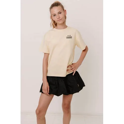 Fris, zonnig en helemaal van nu, dit geel meisjes T-shirt van katoen van Frankie&Liberty is een praktische basic met een stoer detail. De heldere gele kleur valt op zonder te schreeuwen en de backprint aan de achterkant geeft net dat extra accent. Het T-shirt is gemaakt van 100% katoen, waardoor de stof soepel en zacht aanvoelt op de huid, prettig voor lange schooldagen of ontspannen weekendmomenten.Details die het verschil maken Gemaakt van 100% katoen voor een zachte en comfortabele touch Korte, wijde mouwen voor een moderne, relaxte look Ronde hals die mooi aansluit zonder strak te zitten Backprint op de rug als stoer detail Zonder sluiting, gewoon over het hoofd aan en klaar Geschikt voor schoolkinderen en tienersMakkelijk te stylen in elke dagelijkse outfitDit T-shirt past goed bij een jeans, cargobroek of korte broek. Sneakers eronder en je kind is klaar voor school, een dagje stad of een logeerpartijtje. De wijde mouwen geven genoeg bewegingsruimte, ideaal voor actieve dagen.Frankie&Liberty voor modebewuste girlsFrankie&Liberty staat voor eigentijdse kindermode met een volwassen gevoel voor stijl. De collecties sluiten aan op de laatste trends, maar blijven draagbaar voor elke dag. Met dit T-shirt kies je voor een doordacht ontwerp met aandacht voor uitstraling en draagcomfort.Een vrolijke basic die moeiteloos meebeweegt met drukke, gezellige dagen.