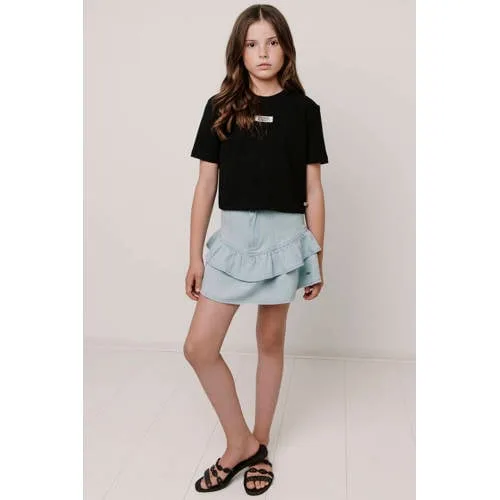 Dit zwart meisjes T-shirt van Frankie&Liberty is een praktische basic met een moderne twist. De effen zwarte kleur maakt het shirt makkelijk te combineren, terwijl de wijde korte mouwen zorgen voor een eigentijdse look. Door de ronde hals en het zachte materiaal voelt het comfortabel aan tijdens schooldagen, vrije tijd en alles daartussenin.Details waar je elke dag iets aan hebt Gemaakt van 95% katoen / 5% elastaan voor een zachte stof met lichte stretch Effen zwarte kleur die eenvoudig te combineren is met jeans, rok of short Korte, wijde mouwen voor een luchtig en modern silhouet Ronde hals die prettig aansluit en niet knelt Zonder sluiting, het shirt trek je eenvoudig over het hoofd aan Wasbaar op 30 graden, niet drogen in de droogtrommel en lauw strijkbaar (1 punt) Geschikt voor schoolkind en tiener, 1 stuk in de verpakkingElke dag draagbaarDit T-shirt past goed bij de dagelijkse garderobe van meisjes die houden van een rustige, maar moderne stijl. Draag het naar school met een wijde jeans, of combineer het in het weekend met een korte rok en sneakers voor een comfortabel setje.Frankie&Liberty voor kinderen en tienersFrankie&Liberty richt zich op kindermode met een modieuze en eigentijdse uitstraling. De ontwerpen sluiten aan bij wat kinderen en tieners nu graag dragen, met aandacht voor pasvorm en draagcomfort. Zo ontstaat kleding die er verzorgd uitziet en prettig zit gedurende de hele dag.Een veelzijdig T-shirt dat moeiteloos meebeweegt met drukke, gezellige dagen.