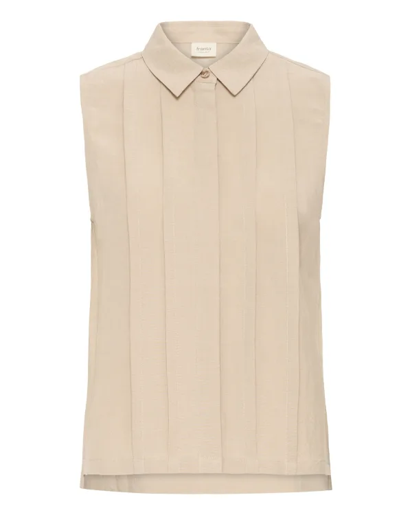 Blouse type: Blouseshirt; Design: Knop sluiting; Materiaal: Lyocell; Motief: Effen; Kraag: Kentkraag; Details: Plissé; Extra's: Op staal naden; Pasvorm: Normale pasvorm; Armlengte: Mouwloos; Lengte: Normale lengte