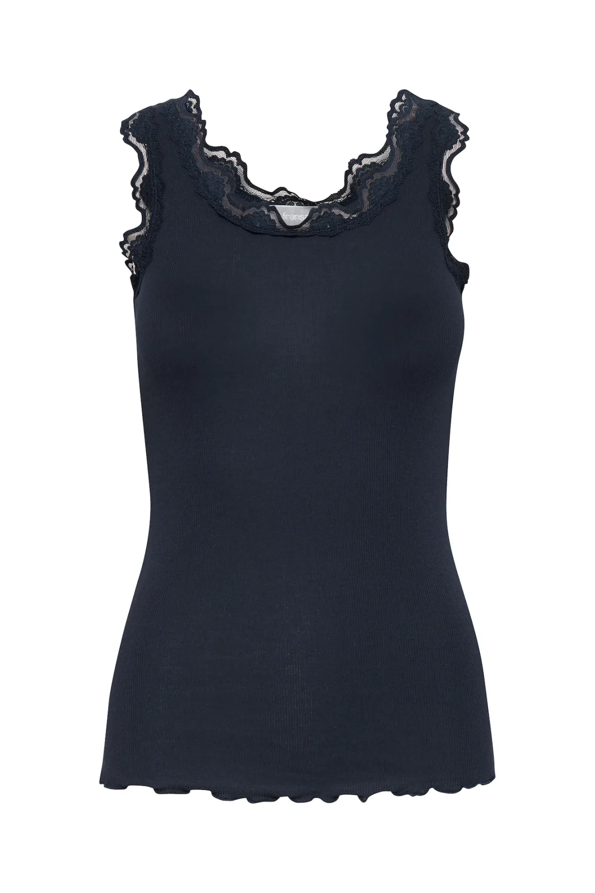 Design: Geribbeld gebreid, Gerolde boord; Materiaal: Jersey; Halstype: Ronde hals; Motief: Effen; Soort bandjes: Brede bandjes; Details: Kant; Extra's: Op staal naden; Pasvorm: Slanke pasvorm; Armlengte: Mouwloos; Lengte: Normale lengte