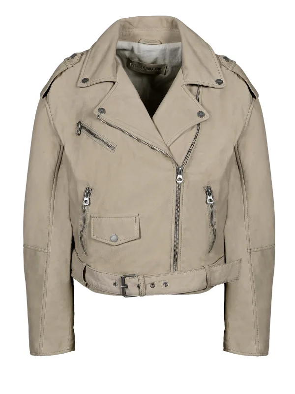 Design: Revers kraag, Met riem, Ritszakken aan de zijkant; Type sluiting: Ritssluiting; Type jas: Bikerjack; Voering: Licht gevoerd; Materiaal: Leer; Motief: Effen; Extra's: Studs, Pailletten, Riemlussen; Pasvorm: Normale pasvorm