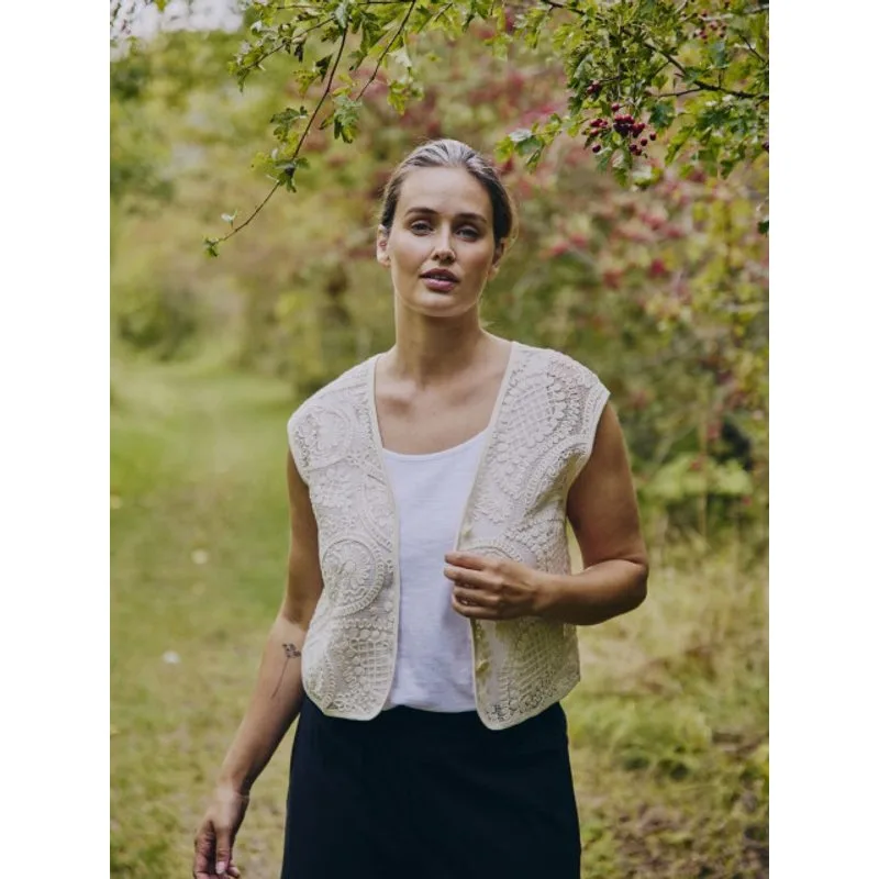Voeg een stijlvolle en zachte touch toe aan je outfit met dit elegante gilet van Freequent in de kleur Moonbeam. Het mouwloze model is uitgevoerd in een verfijnd, opengewerkt patroon dat zorgt voor een speelse en vrouwelijke uitstraling. De lichte tint maakt dit item perfect om eindeloos te combineren – van casual tot chic. Het gilet heeft een V-hals, een knoopsluiting aan de voorkant en een comfortabele pasvorm. Draag het over een blouse voor een geklede look of combineer met een T-shirt voor een meer ontspannen stijl. Materiaal 100% Kateon. Patroon: Effen. Knoopsluiting Valt kort