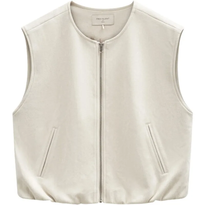 Gilet van Freequent, uitgevoerd in een zacht en luxe imitatiesuède dat zorgt voor een elegante uitstraling en een comfortabel draaggevoel. Het gilet heeft een eenvoudig, modern design met brede schouderbanden, een ronde hals en een ritssluiting. De zakken aan de voorzijde en het subtiele balloon-effect geven het model een eigentijdse en modieuze touch. Materiaal: Buitenkant: 95% polyester, 5% elastaan. Voering: 100% polyester. Valt normaal uit.