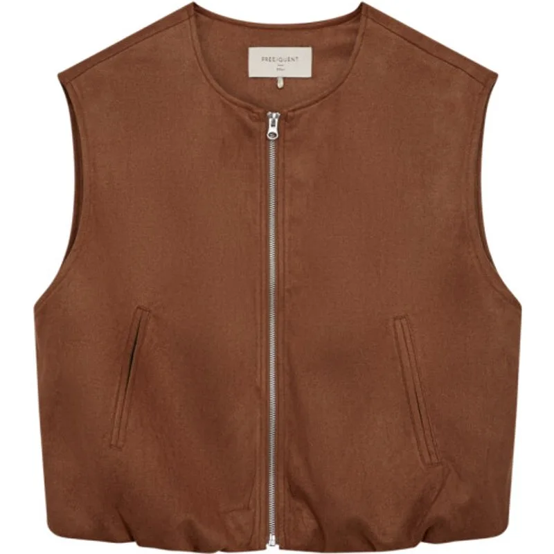 Gilet van Freequent, uitgevoerd in een zacht en luxe imitatiesuède dat zorgt voor een elegante uitstraling en een comfortabel draaggevoel. Het gilet heeft een eenvoudig, modern design met brede schouderbanden, een ronde hals en een ritssluiting. De zakken aan de voorzijde en het subtiele balloon-effect geven het model een eigentijdse en modieuze touch. Materiaal: Buitenkant: 95% polyester, 5% elastaan. Voering: 100% polyester. Valt normaal uit.