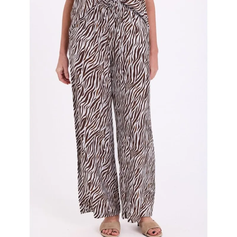 Broek van Freequent in een lichte stof met zebraprint. De broek heeft een casual model met een elastische tailleband met trekkoord, een middelhoge taille, zijzakken en wijde, lange broekspijpen in een rechte pasvorm. Materiaal: 80% viscose 20% polyamide Patroon: dierenprint. Elastische boord