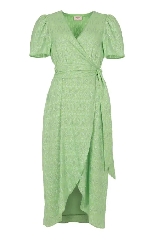 Gemaakt van een luxueuze lurex-viscose mix, straalt deze jurk pure elegantie uit. De jurk heeft een flatterende overslag en een delicate striksluiting die je taille prachtig accentueert. Het luchtige ontwerp met korte mouwen maakt het perfect voor elk seizoen. De subtiele glans en het prachtige groene dessin geven de jurk een unieke uitstraling.