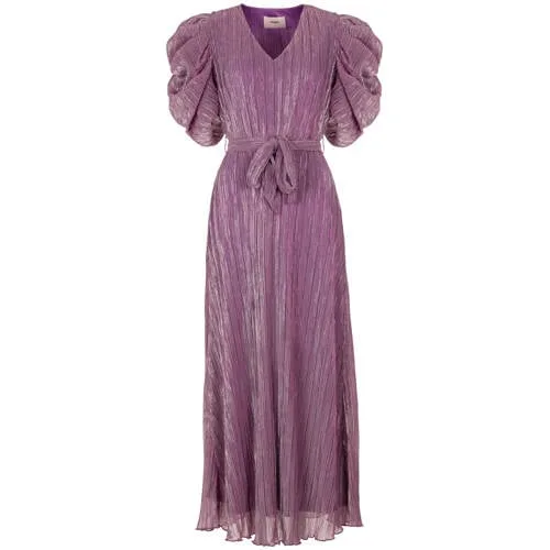 De paarse Freebird jurk Deli is een midi jurk met een feestelijke uitstraling, perfect voor een avond uit. De subtiele glans door de lurex draad en de fijne plisséstructuur zorgen voor een opvallende look, terwijl de A-lijn pasvorm soepel rond je lichaam valt. De half lange pofmouwen en de V-hals geven de jurk een vrouwelijke en moderne uitstraling, passend bij een bruiloft of een andere feestelijke gelegenheid.Feestelijke details met een comfortabele fit Midi lengte tot rond de knie voor een elegante, middel lange look A-lijn pasvorm die soepel uitloopt vanaf de taille V-hals die het decolleté subtiel accentueert Half lange pofmouwen voor een stijlvolle, geklede uitstraling Glimmende lurex en plissé voor een verfijnde feestlook Striksluiting in de taille, zodat je de jurk naar wens kunt tailleren Riemlussen aanwezig, handig als je een eigen ceintuur wilt dragen Effen paarse kleur die goed combineert met hakken of sandalen Maatadvies: valt normaal, kies je gebruikelijke maatPerfect voor bruiloft, diner of avondje uitDeze avondjurk past goed bij momenten waarop je je net wat meer wilt aankleden. Van bruiloftsgast tot etentje of verjaardag, de glanzende stof en plissé zorgen voor een verzorgde en feestelijke uitstraling.Freebird studio collectieFreebird staat bekend om eigentijdse jurken die zijn ontworpen voor momenten waarop je iets te vieren hebt. De Studio collectie focust op feestelijke ontwerpen met doordachte details, zodat je bij iedere gelegenheid stijlvol voor de dag komt.Een elegante keuze als je zoekt naar een feestjurk die comfortabel draagt en tegelijkertijd opvalt door de glanzende stof en plissé.