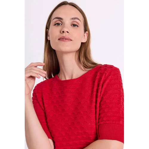 Deze rode gebreide dames top van katoen van FREEQUENT is een fijne basic voor elke dag. De effen kleur geeft een rustige uitstraling, terwijl het ingebreide patroon en de geribde boorden net wat extra nuance toevoegen. Gemaakt van 100% katoen, voelt de stof zacht en soepel aan op de huid, ideaal voor het voorjaar en de frissere dagen tussendoor.Details die het verschil maken Gemaakt van 100% katoen voor een zachte touch en prettig draagcomfort Effen rode kleur, makkelijk te combineren met jeans, rok of pantalon Gebreide kwaliteit met subtiel ingebreid effect voor een rustige, verzorgde look Lange, rechte mouwen die mooi langs de armen vallen Ronde hals die netjes aansluit zonder te hoog te sluiten Geribde boorden bij hals, mouwen en onderkant voor een mooie pasvorm Zonder zakken voor een strak en clean silhouetGemakkelijk te stylen in je dagelijkse outfitsDe top past goed in een garderobe voor het lente seizoen. Combineer met een hoge jeans en sneakers voor een casual dag of draag de top op een nette broek met laarsjes voor een meer geklede uitstraling. Door de rustige effen kleur is er ruimte voor sieraden of een opvallende tas.FREEQUENT: moderne basics met een vrouwelijke touchFREEQUENT staat bekend om kleding die makkelijk te dragen is in het dagelijks leven, met aandacht voor vrouwelijke lijnen en comfortabele materialen. De collecties zijn goed op elkaar afgestemd, zodat je items eenvoudig kunt combineren tot een samenhangende garderobe.Een veelzijdige top die je garderobe een frisse, rode basis geeft voor vele combinaties.