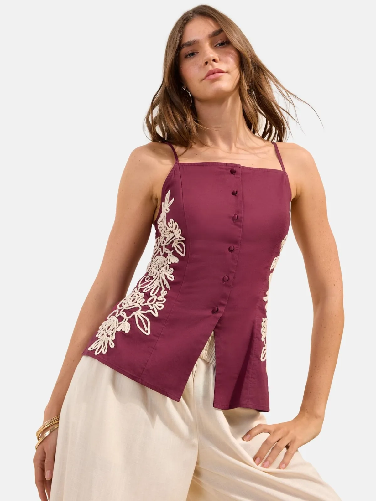 Blouse type: Klassieke blouse; Design: Rechte zoom, Knop placket; Type sluiting: Knoopsluiting; Materiaal: Katoen; Halstype: Carréhals; Kraag: Zonder kraag; Soort bandjes: Spaghettibandjes; Details: Borduursels, Gedrapeerd; Extra's: Verstelbare bandjes; Pasvorm: Slanke pasvorm; Armlengte: Mouwloos; Lengte: Normale lengte