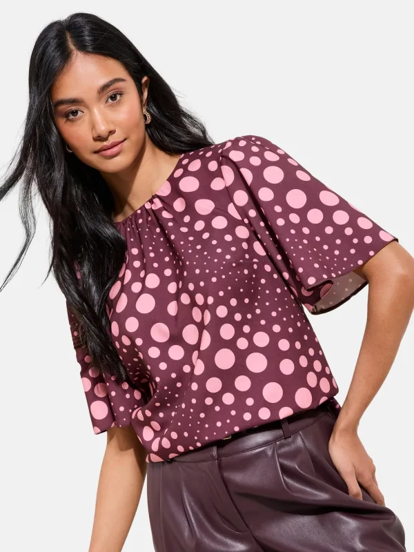 Blouse type: Blouseshirt; Design: Om te knopen/binden; Type sluiting: Snoersluiting; Motief: Gestippeld; Kraag: Zonder kraag; Details: Cut-outs, Gedrapeerd; Extra's: All-over patroon; Pasvorm: Normale pasvorm; Armlengte: Halve mouw; Lengte: Normale lengte
