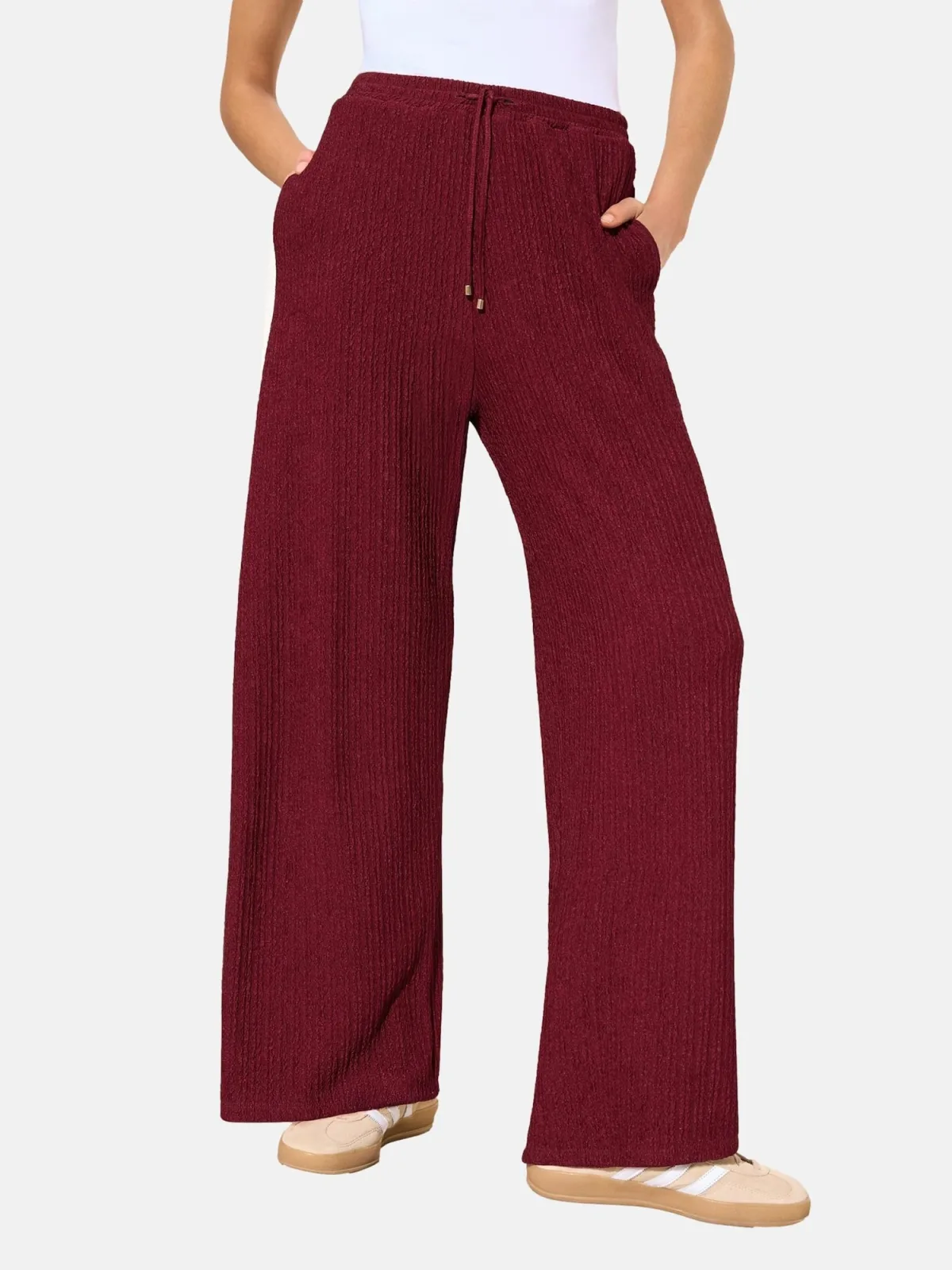 Design: Taille met trekkoord, Elastische taille/zoom, Zakken aan de zijkant; Motief: Effen; Details: Gedrapeerd; Extra's: Op staal naden, Met textuur; Lengte: Lang/maxi; Pasvorm: Wide leg; Taillehoogte: High waist