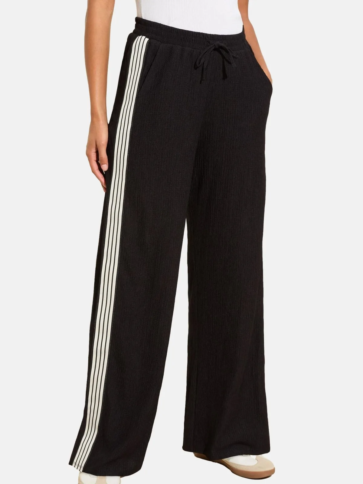 Design: Elastische taille/zoom, Zakken aan de zijkant; Materiaal: Jersey; Motief: Gestreept; Details: Zijstrepen; Extra's: Op staal naden, Voelt zacht aan; Lengte: Lang/maxi; Pasvorm: Wide leg; Taillehoogte: Mid waist