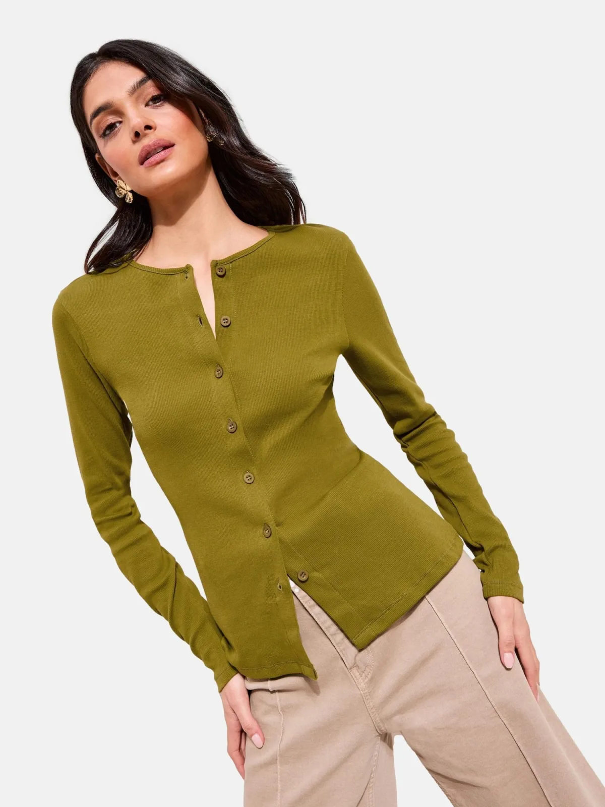 Design: Geribbeld gebreid; Type sluiting: Knoopsluiting; Materiaal: Jersey; Halstype: Ronde hals; Motief: Effen; Extra's: Voelt zacht aan; Pasvorm: Slanke pasvorm; Armlengte: Lange mouw; Lengte: Normale lengte