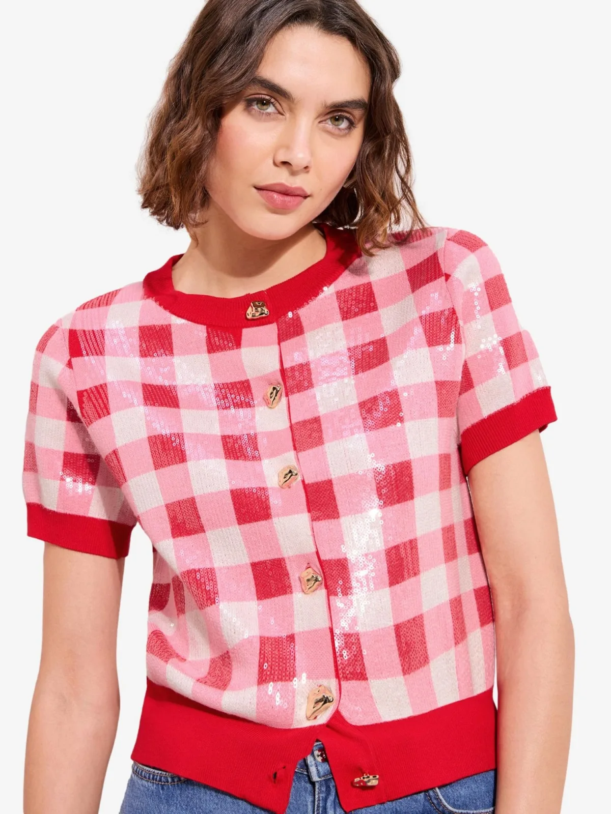 Design: Geribbelde kraag, Rechte zoom; Type sluiting: Knoopsluiting; Materiaal: Knitwear; Halstype: Ronde hals; Motief: Geruit; Details: Pailletten; Extra's: All-over patroon, Applicaties; Pasvorm: Normale pasvorm; Armlengte: Kwartmouw; Lengte: Korte pasvorm
