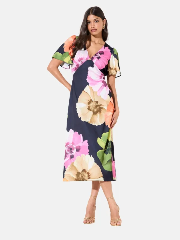 Design: Gevoerde zoom/rand; Materiaal: Satijn; Halstype: V-hals; Motief: Bloemenprint; Details: Gedrapeerd; Extra's: All-over patroon; Lengte: 3/4 lengte; Snit: Getailleerd; Pasvorm: Normale pasvorm; Armlengte: Halve mouw