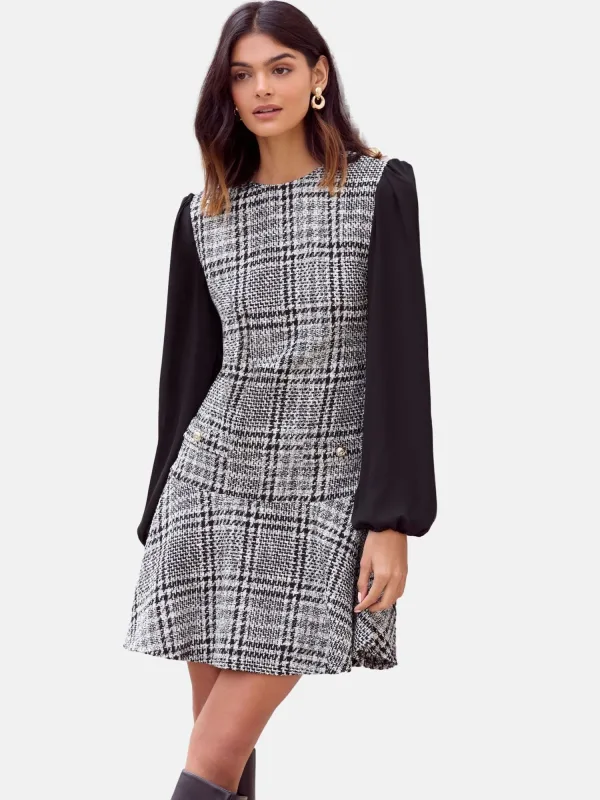 Design: Gevoerde zoom/rand, Rechte zoom; Type sluiting: Ritssluiting; Materiaal: Bouclé; Halstype: Ronde hals; Motief: Geruit; Details: Gedrapeerd; Extra's: Met textuur; Lengte: Kort/mini; Snit: Getailleerd; Pasvorm: Normale pasvorm; Armlengte: Lange mouw