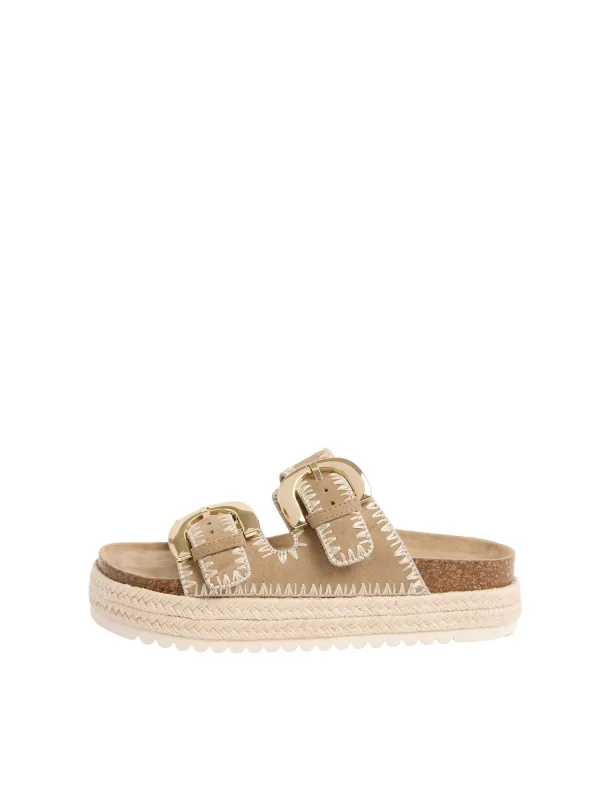 Design: Anatomisch gevormd voetbed, Hak/zool met raffia-look, Zool van kurk; Type sluiting: Slip; Materiaal: Imitatieleder; Motief: Effen; Plateau: Met plateau; Materiaal: Imitatieleer; Schoenneus: Open toe; Extra's: Velours look; Hakhoogte: Platte hak (0-3 cm); Pasvorm van de schoenen: Breed