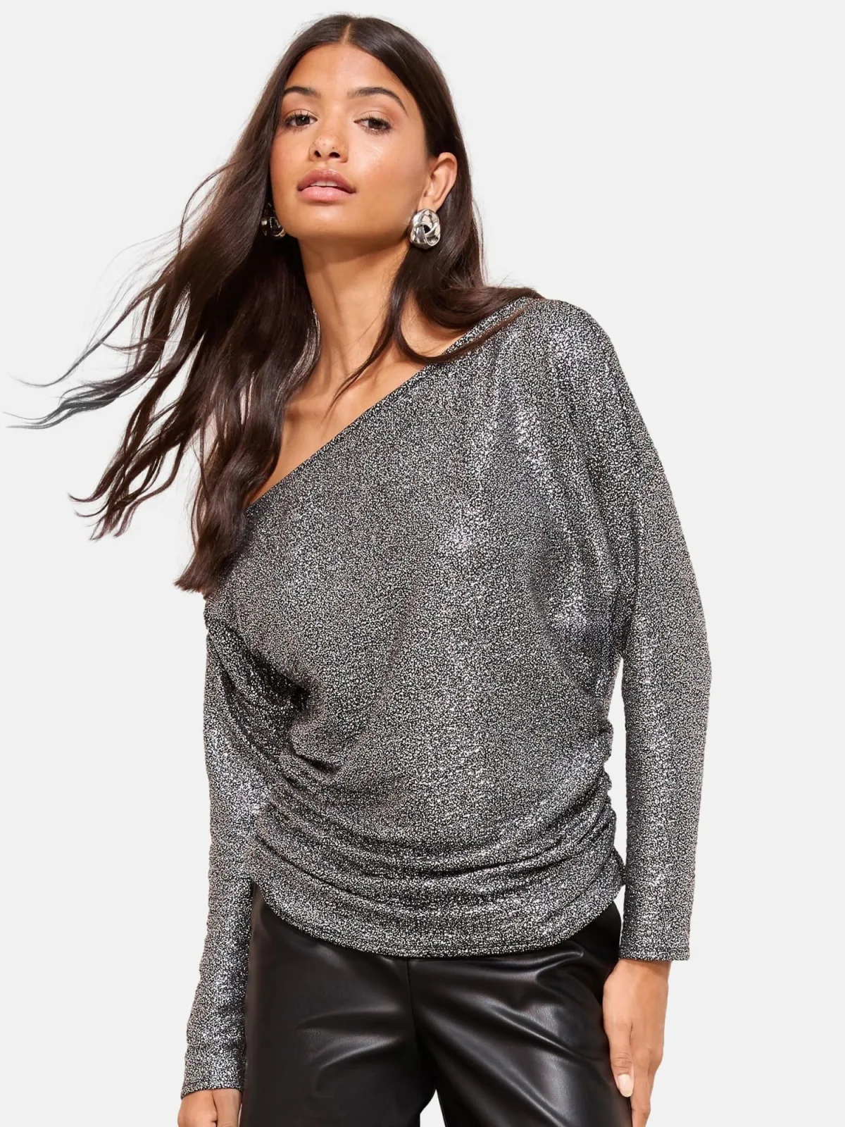 Design: Brede mouwopeningen; Materiaal: Jersey; Halstype: Carmen hals; Motief: Effen; Details: Gedrapeerd; Extra's: Glanzend; Pasvorm: Normale pasvorm; Armlengte: Lange mouw; Lengte: Normale lengte