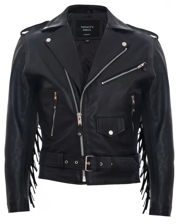 - Bij to-be-dressed.nl kun je Fringe Hide Leather Brando kwastjes motorfiets bikerjack kopen voor slechts €166,99