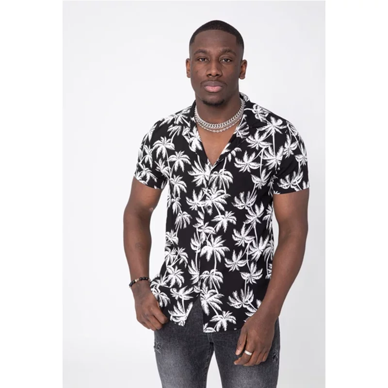 Heren Overhemd Korte Mouw – Frivilin by Style Italy Dit stijlvolle herenoverhemd met korte mouwen is perfect voor de zomer. Het overhemd is gemaakt van een lichte en ademende stof, wat zorgt voor optimaal draagcomfort op warme dagen. Dankzij de open kraag krijgt het een casual en trendy uitstraling. Het overhemd is vervaardigd uit lichte stretch viscose, waardoor het een soepele pasvorm heeft en comfortabel aanvoelt. De licht zwarte kleur met subtiele witte palmprint geeft een frisse en moderne look. Ideaal om te combineren met een short, jeans of bermuda voor een verzorgde,