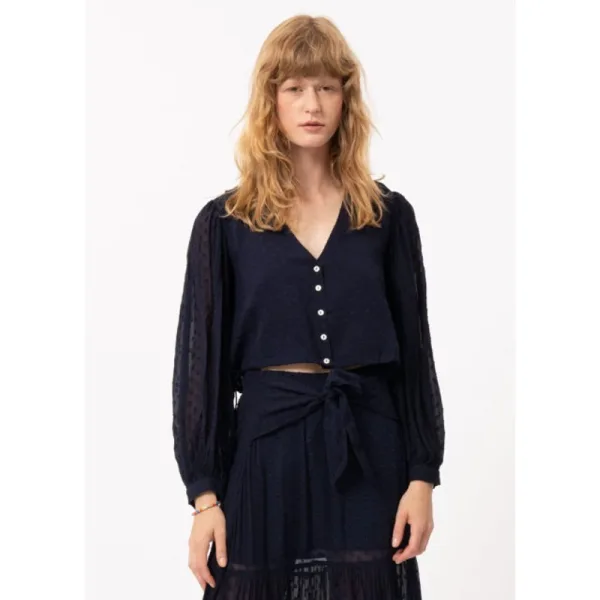 Blauwe V-hals crop top van het merk FRNCH. De donkerblauwe Nydia blouse heeft een V-hals. knoopsluiting en lange semi-transparante mouwen. Super leuk te combineren op de glanzende satijnen cargo broek Nouma van FRNCH. Materiaal: 100% viscose.