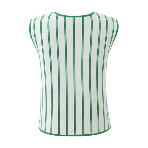 Deze FRNCH mouwloze dames top brengt een frisse, zomerse uitstraling in je garderobe. De ecru/groene strepen geven een speels lijnenspel, terwijl de gebreide structuur net wat meer textuur toevoegt dan een gewone T-shirtstof. De ronde hals en het mouwloze model zorgen voor een open, luchtig gevoel, ideaal voor warme dagen en lange avonden buiten.Gebreide top met zomerse strepen Ecru/groene streepprint voor een frisse, zomerse look Gebreide kwaliteit met wol voor een zachte, comfortabele touch Mouwloos model, prettig licht om te dragen op warme dagen Ronde halslijn die mooi aansluit zonder strak te voelen Knoopsluiting, handig bij het aan- en uittrekken Geen zakken, waardoor de top mooi slank langs het lichaam valt Onderdeel van een co-ord set, voor wie graag een compleet, afgestemd geheel draagtZomerse styling voor festival en vakantieDeze top past goed bij het zomerse gevoel van festivals en vakanties. Combineer met een hoge taille jeans, een linnen short of een zwierige rok en draag er sandalen of sneakers onder. Door de gebreide stof voelt de top comfortabel aan, terwijl de mouwloze snit en strepen een lichte, ontspannen uitstraling geven.Parijse flair van FRNCHFRNCH staat bekend om eigentijdse ontwerpen met Parijse flair. Het merk combineert moderne pasvormen met doordachte details en opvallende prints. Met deze top kies je voor een stijl die modieus is, maar ook draagbaar in het dagelijks leven.Een luchtige, gestreepte basic die je eenvoudig meeneemt van zomerse dag naar zwoele avond.