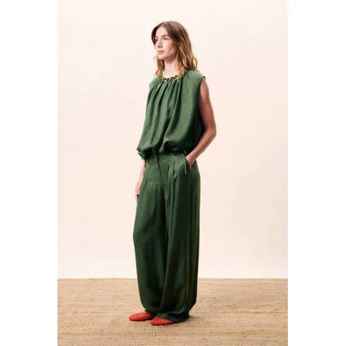 Ga voor een losse, maar toch geklede look met deze groene wide leg broek met hoge taille van FRNCH. De lange pijpen vallen soepel langs je lichaam en creëren een rechte lijn langs je benen. Door de high waist wordt je middel duidelijk geaccentueerd, terwijl de comfortabele pasvorm ruimte geeft bij heupen en benen.Details die het verschil maken Wide leg model voor een luchtige pasvorm en eigentijdse look Hoge taille die aansluit en je silhouet benadrukt Gemaakt van 62% viscose en 38% lyocell, voor een soepele stof met een zachte touch Rits, haak- en knoopsluiting voor een nette, afgewerkte look Lange lengte, ideaal om te dragen met zowel sneakers als hakken Co-ord set / pak: te combineren met een bijpassend item tot een compleet pak Groene kleur die goed te combineren is met neutrale tinten in je garderobeVeelzijdig in je dagelijkse outfitsDeze broek past net zo makkelijk in een werkoutfit als in een casual look. Combineer met een eenvoudige top en sneakers voor een ontspannen dag, of draag er een blouse en loafers bij voor een meer geklede stijl. Door de soepele stof voelt de broek licht aan, ook tijdens lange dagen.Parijse stijl van FRNCHFRNCH staat voor moderne ontwerpen met een Parijse knipoog. Heldere lijnen, doordachte details en fijne materialen komen samen in kleding die je makkelijk combineert en vaak draagt. Met deze broek voeg je een net en veelzijdig item toe aan je dagelijkse garderobe.Een ontspannen broek die past bij zowel kantoor als een dag in de stad.