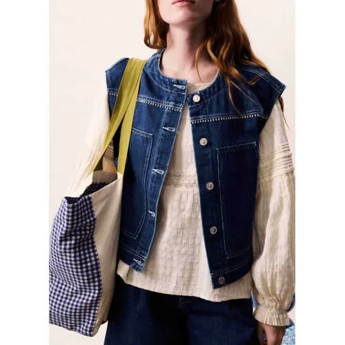 Geef je outfit een moderne uitstraling met deze mouwloze cropped jas voor dames in dark blue denim van FRNCH. De korte lengte benadrukt je taille en geeft een duidelijk silhouet, terwijl de dark blue denim kleur een wat stoerdere uitstraling heeft dan een klassieke spijkerjas. Door het mouwloze ontwerp blijft er ruimte voor laagjes met tops, T-shirts of een blouse eronder.Eigentijdse denim look Cropped lengte voor een moderne, korte pasvorm Mouwloos design, ideaal om te combineren met verschillende tops Gemaakt van 90% katoen / 10% viscose voor een zachte, soepel vallende stof Ronde hals voor een subtiele, rustige uitstraling Dark blue denim kleur als neutrale, stoere basis Onderdeel van een co-ord set, voor een compleet op elkaar afgestemde lookElke dag anders te stylenDeze mouwloze jas draag je makkelijk over een basic T-shirt met een hoge taille broek of rok. Voor een meer geklede combinatie kies je voor de cropped lengte in combinatie met een nette blouse of aansluitende jurk. Als co-ord set zorg je in één keer voor een rustig geheel, praktisch als je weinig tijd hebt maar wel een afgestemde outfit wilt dragen.FRNCH: moderne stijl met een Franse knipoogFRNCH maakt eigentijdse collecties met een duidelijke Franse invloed. Het merk combineert draagbare modellen met doordachte details en eigentijdse pasvormen. Zo ontstaat kleding die je makkelijk in het dagelijks leven draagt en die herkenbaar is door de karakteristieke stijl.Een mouwloze denim jas die je in elk seizoen gemakkelijk combineert.