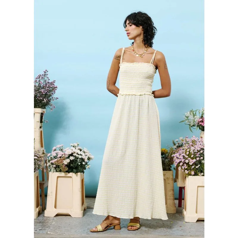 De FRNCH Marianne jurk is hét ultieme zomeritem voor een luchtige en elegante look. Deze lange maxi-jurk is uitgevoerd in een subtiel geel geruit patroon en gemaakt van een ademende katoen-linnenblend. De gesmokte buste met fijne plooien zorgt voor een flatterende pasvorm, terwijl de verstelbare dubbele bandjes een speelse touch geven. De zachte structuur van de stof en het zwierige silhouet maken deze jurk perfect voor warme dagen. Draag 'm met sandalen of sneakers en je bent klaar voor een zomerse dag in stijl. Product details: Merk: FRNCH Model Marianne Maxi-jurk Kleur: geel Maxi-lengte zomerjurk Subtiele gele strepen Gesmokte buste met plooien (elastisch) Dubbele, verstelbare schouderbandjes Materiaal: 70% katoen, 30% linnen Machinewasbaar op 30°C Valt op maat – het model is 1.75 m en draagt maat S
