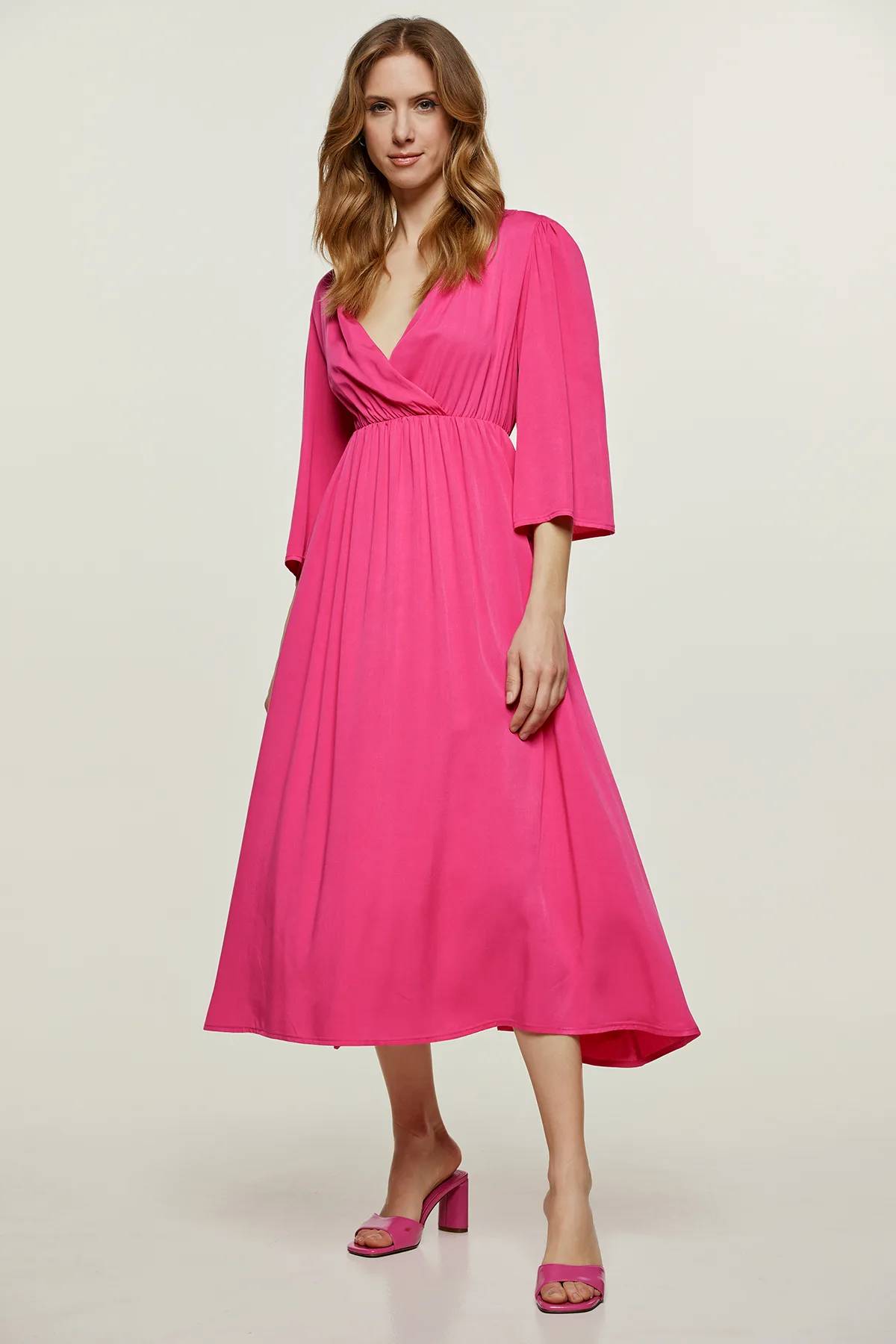 Deze fuchsia zomerse faux wikkeljurk is gemaakt van geweven stof. Het heeft klokmouwen van ¾ lengte met splitjes aan de manchetten. De jurk heeft elastiek onder de buste voor plooien en een empire-lijn. De jurk heeft een losse pasvorm en een midi-lengte.