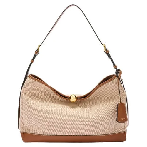 Een lichte, maar toch stevige tas voor elke dag, dat is deze Furla schoudertas in beige/cognac. De combinatie van zachte katoenen stof met leren details en goudkleurige hardware geeft een verzorgde uitstraling die zowel bij een casual outfit als bij nette kleding past. Het middelgrote formaat biedt genoeg ruimte voor je dagelijkse essentials zonder te groot te ogen aan je schouder.Verzorgde details en praktisch formaat Gemaakt van 60% katoen / 40% leer voor een stevige tas met een zachte touch Middelgroot formaat met een breedte van 38 cm, hoogte van 25 cm en diepte van 8.5 cm Beige/cognac kleur met goudkleurige hardware voor een tijdloze, nette look Verstelbare schouderband voor een draaghoogte die je eenvoudig aanpast Veilige kliksluiting zodat je persoonlijke spullen goed opgeborgen blijven Effen design uit de Studio collectie, makkelijk te combineren met verschillende stijlenVoor werk, stad en weekendDeze schoudertas is handig voor dagen waarin je net wat meer mee wilt nemen, zoals je portemonnee, telefoon, sleutels, een klein notitieboekje en bijvoorbeeld een zonnebril. Door het middelgrote formaat hangt de tas comfortabel langs je lichaam en blijft alles overzichtelijk binnen handbereik.Italiaanse elegantie van FurlaFurla staat bekend om tassen met een heldere vormtaal, mooie materialen en zorg voor afwerking. De ontwerpen zijn gericht op dagelijks gebruik, met een stijl die lang actueel blijft. Zo haal je een tas in huis waar je seizoen na seizoen plezier van hebt.Een praktische keuze voor wie een schoudertas zoekt met een rustige, doordachte uitstraling.