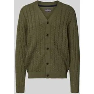 Gebreid herenjack van Fynch-Hatton;Mix van katoen en wol;Los model;Ribboorden;V-hals;Knoopsluiting;Ruglengte bij maat M: 70 cm;Mouwlengte bij maat M: 75 cm