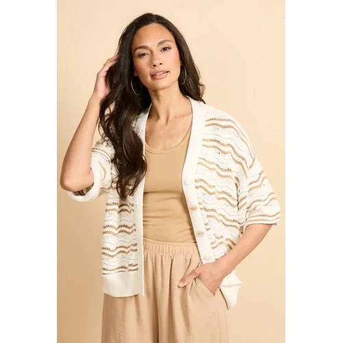 Geef je voorjaarslook een frisse update met het G-maxx Helmi knitting cardigan. Dit korte, gebreide vest in wit met lichtbruine strepen heeft een open, luchtige ajourstructuur en is gemaakt van 100% katoen. De V-hals en de knoopsluiting zorgen voor een verzorgde uitstraling die zowel casual als iets gekleder te dragen is.Gebreid vest met verfijnde details Korte lengte, ideaal boven een hoge broek of rok Half lange, wijde mouwen voor een ontspannen silhouet Ajour en ingebreid patroon voor een luchtige, voorjaarswaardige look Streepdesign in wit/lichtbruin dat makkelijk combineert met je basisitems V-hals met knoopsluiting, geschikt over een top of direct op de huid Gemaakt van 100% katoen, met een soepele en ademende touch Zonder zakken, waardoor de vorm rustig oogtZo draag je dit katoenen vestDit vest combineert goed met lichte denims, een rechte pantalon of een zwierige rok. Draag het in het voorjaar over een simpel T-shirt of een kanten top, en op frissere dagen onder een trenchcoat of tussenjas. Door de korte lengte ligt de nadruk op de taille, wat aansluit bij hoge tailles.G-maxx: vrouwelijke mode voor elke dagG-maxx staat voor toegankelijke collecties met aandacht voor pasvorm en draaggemak. De items sluiten aan op de trends van nu en zijn tegelijk praktisch voor dagelijks gebruik. Met dit vest kies je voor een kledingstuk dat eenvoudig te combineren is met de rest van je garderobe.Een gebreid vest dat je garderobe klaar maakt voor het nieuwe seizoen.