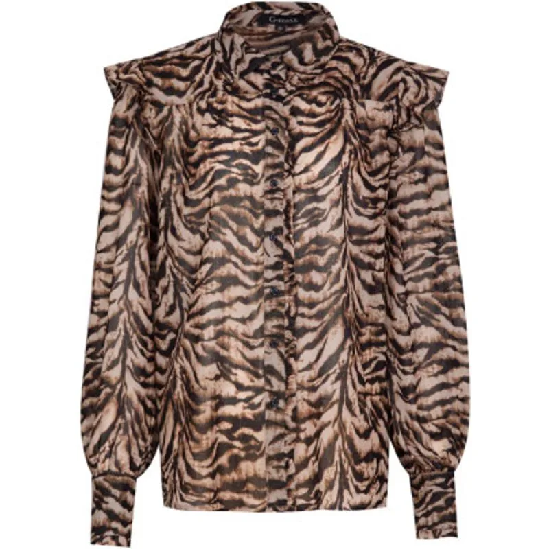 Een tijdeloze print dat we graag dragen is de dierenprint. De Rowena blouse is voorzien van een bruine tijgerprint met een knoopsluiting en ruffles op de schouders.Extra details zijn: Dierenprint Knoopsluiting Opvallende schouderpartij Allover printMateriaal:100% PolyesterWasvoorschrift:Machinewas max. Fijnwas 30 graden Celsius. Niet in droger