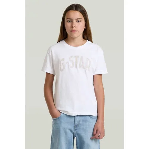 Dit witte G-STAR meisjes T-shirt van katoen is een basic voor elke dag. Het shirt heeft korte mouwen, een ronde hals en een tekstprint aan de voorkant. Gemaakt van 100% katoen voelt het zacht aan op de huid en is het prettig om de hele dag te dragen, of dat nu naar school, in het weekend of op vakantie is.Praktische pasvorm voor schoolkind en tiener Gemaakt van 100% katoen, voelt zacht en comfortabel aan Korte mouwen en een rechte pasvorm voor een ontspannen fit Ronde hals die makkelijk over het hoofd gaat Witte kleur die goed combineert met jeans, shorts of een rok Tekstprint aan de voorkant voor een casual uitstraling Geschikt voor schoolkind en tiener, passend bij alledaags gebruikVoor alledaagse outfitsDit T-shirt is eenvoudig te stylen met een jeans en sneakers of met een short op warme dagen. Door de neutrale witte kleur past het bij veel andere kledingstukken in de kast, zodat je kind er snel en makkelijk een outfit mee samenstelt.G-STAR als vertrouwde basisG-STAR staat voor casual kleding met een moderne uitstraling. De collecties combineren herkenbare details met draagbare basics, zodat je kind zich elke dag makkelijk aankleedt. Met dit T-shirt kies je voor een eenvoudig te combineren item van een bekend merk.Een comfortabele basic waar je kind het hele seizoen plezier van heeft.
