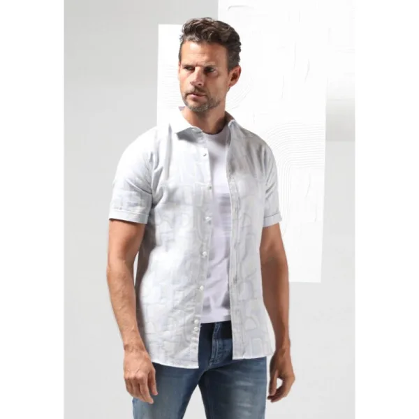 Een moderne lichte overhemd met een all-over print met korte mouwen. De korte mouw en het geborduurde logo op de borst geven een nette, eigentijdse uitstraling.
