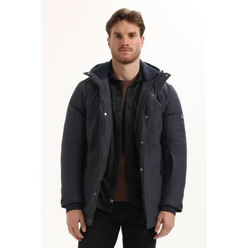 Specificaties: * Pasvorm: regular fit * Waterdichtheid: waterafstotend * Temperatuurregeling: ademend materiaal; warme, isolerende voering; winddicht * Rits: volledige ritssluiting met stormflap * Zakken: twee zakken en twee binnenzakken, allen met ritssluiting * Capuchon: verstelbare capuchon * Manchetten: elastische binnenmanchetten in de mouwuiteinden * Kleur: donkerblauw * Materiaal: 90% polyamide - 10% elastaan
