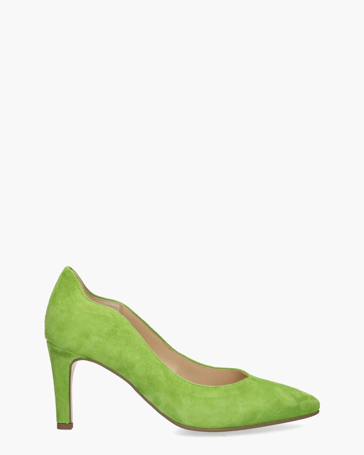 Suède pumps, model 41.381.11, van het merk Gabor. Deze elegante pumps zijn uitgevoerd in een golvend ontwerp en vervaardigd uit suède in een appeltjesgroene tint. De schoenen hebben een spitse neus en een hak van ongeveer 8 cm hoog. De binnenkant is volledig gevoerd met leer en de pumps hebben een vast voetbed. Kleur: groen. (Granny