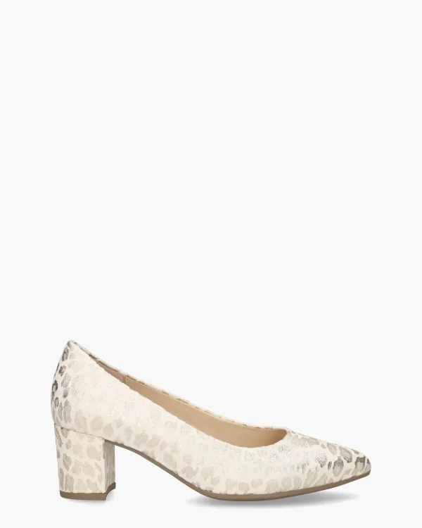 Pumps voor dames 41.450.32 uit de collectie van het merk Gabor. Dit elegante model heeft een bovenzijde van leer in een wit en gouden metallic animalpatroontje. De binnenkant is volledig in zacht leer uitgevoerd en heeft een vast voetbed. Het neusje is iets puntig. Op de rubberen zool en de blokhak met een hoogte van 5,5 cm loop je