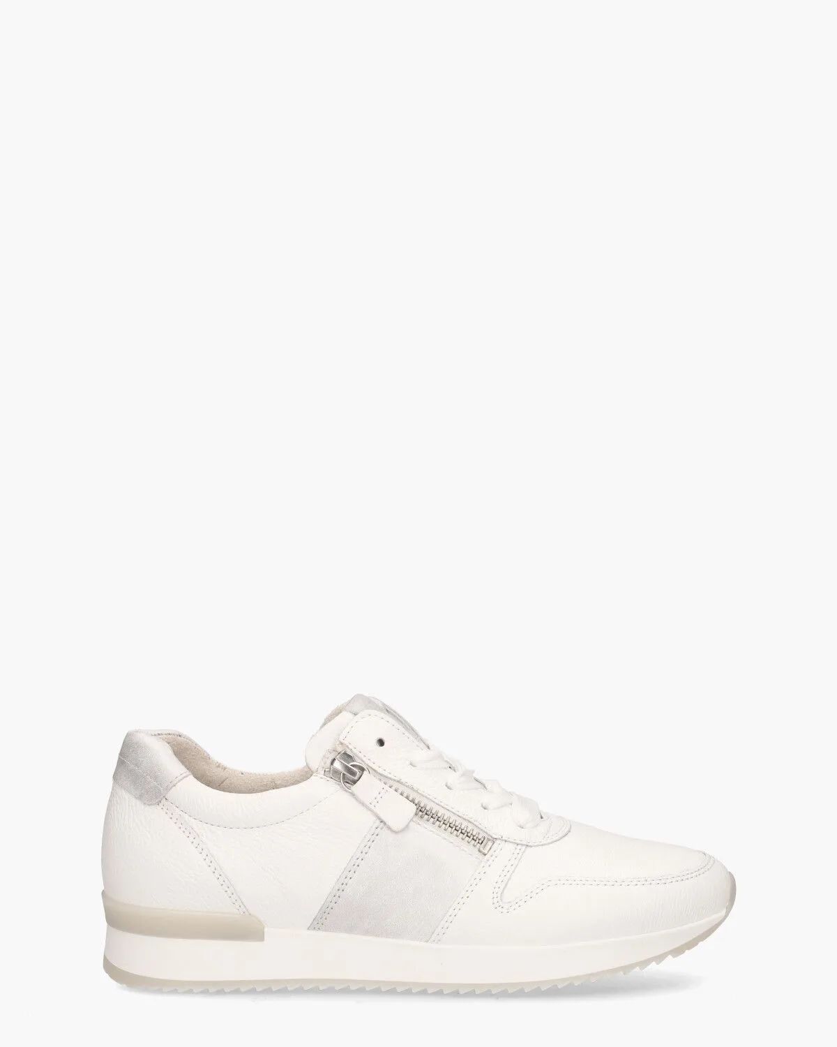 Witte leren sneakers 42.420.20 van Gabor. De binnenkant, inclusief een handig uitneembaar voetbed, is superzacht met suède en leer. Opzij en bij de hielcap geven zilveren details de sneakers een bijzondere touch. Met de handige zilveren ritsjes trek je ze ook nog eens makkelijk aan en uit. De witte/beige rubberen zool heeft een subtiel